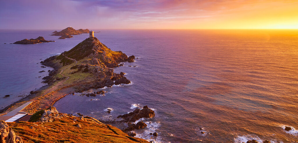 Embarquez pour une croisière au coucher du soleil en direction des mythiques Îles Sanguinaires. Un moment suspendu, entre mer calme et ciel enflammé.